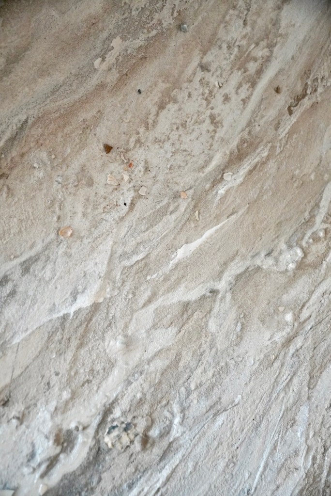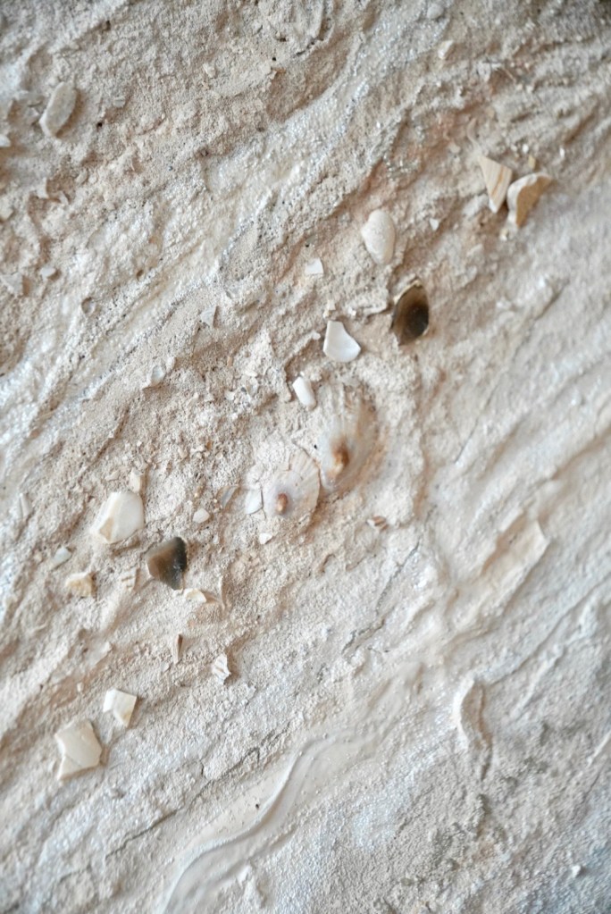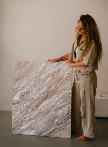 - Tijdens wandelingen langs het strand verzamelde ik zand, schelpen en stenen, ze vormen de basis van het kunstwerk.