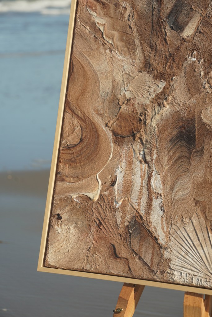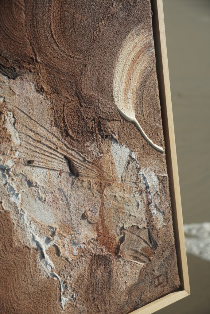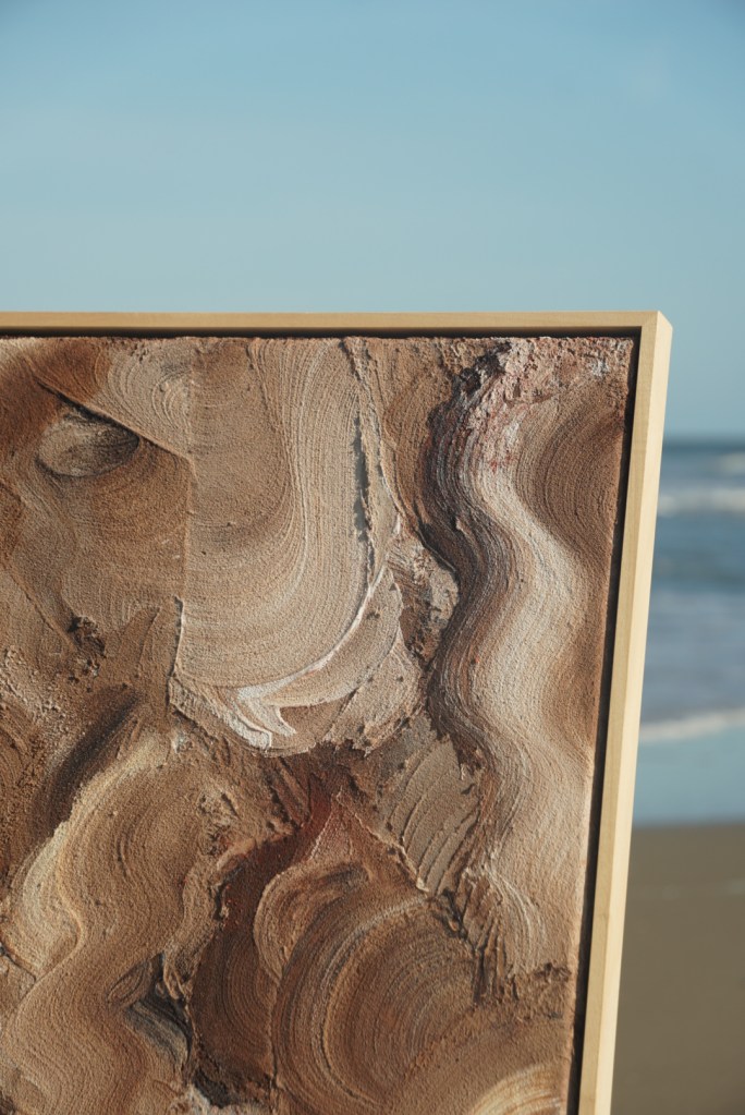 - Tijdens wandelingen langs het strand verzamelde ik zand. Het vormt de basis van het kunstwerk.