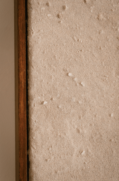 Ontstaan vanuit het ritme van eb & vloed. Het water nam schelpjes en stenen mee, liet ze achter en verweefde ze in het geheel. Wat overblijft zijn fragmenten, korrels zand, steentjes & schelpjes die samen een rustig maar levendig geheel vormen. Je ontdekt subtiele wisselingen zodra het licht erop valt. Tijdens het proces verscheen een regenboog, alsof de natuur zelf meewerkte.