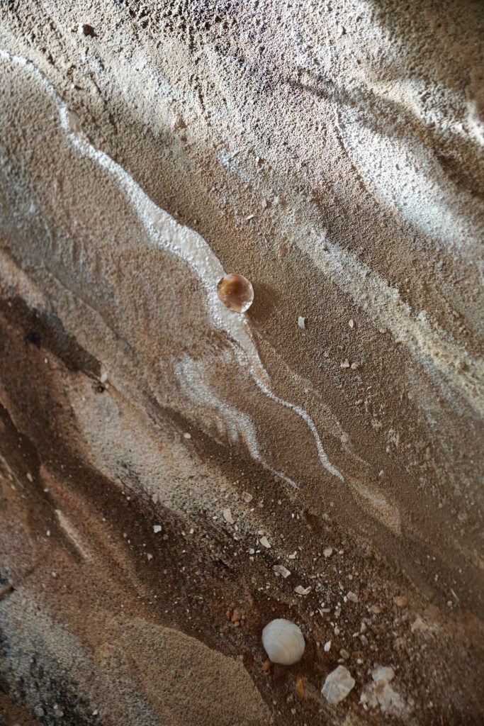 - Tijdens wandelingen langs het strand verzamelde ik zand, schelpen en stenen, ze vormen de basis van het kunstwerk.