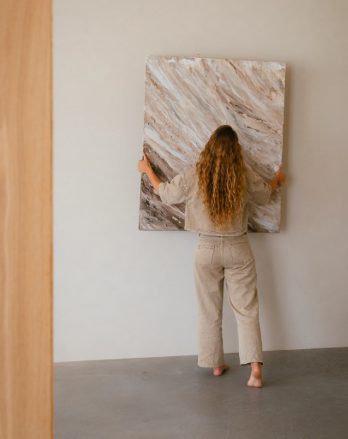 Het werk vangt de rust en de beweging van het strand en nodigt je uit om mee te gaan met de stroom van het leven en te voelen hoe alles beweegt en tegelijkertijd tot rust komt.