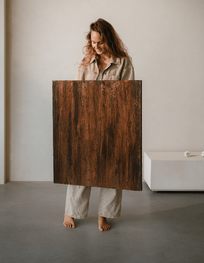 - De zijkanten van het schilderij horen bij het werk, dus het kan rustig ‘vrij’ aan de muur hangen. Je kan ook kiezen voor een handgemaakte lijst van Ayous-hout, in een kleur naar keuze (+350 euro)